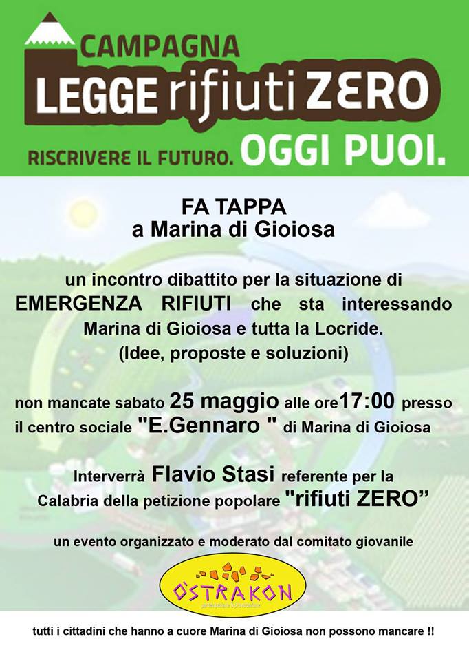 0 La LEGGE RIFIUTI ZERO fa tappa a Marina di Gioisa (RC) Posted on 25 Maggio 2013 by Redazione La Legge Rifiuti Zero fa tappa a Marina di Gioiosa. Oggi 25 Maggio, ore 17:00. Sarà un’occasione per parlare della proposta di legge e dell’attualità del ciclo dei rifiuti calabrese. Non mancate!