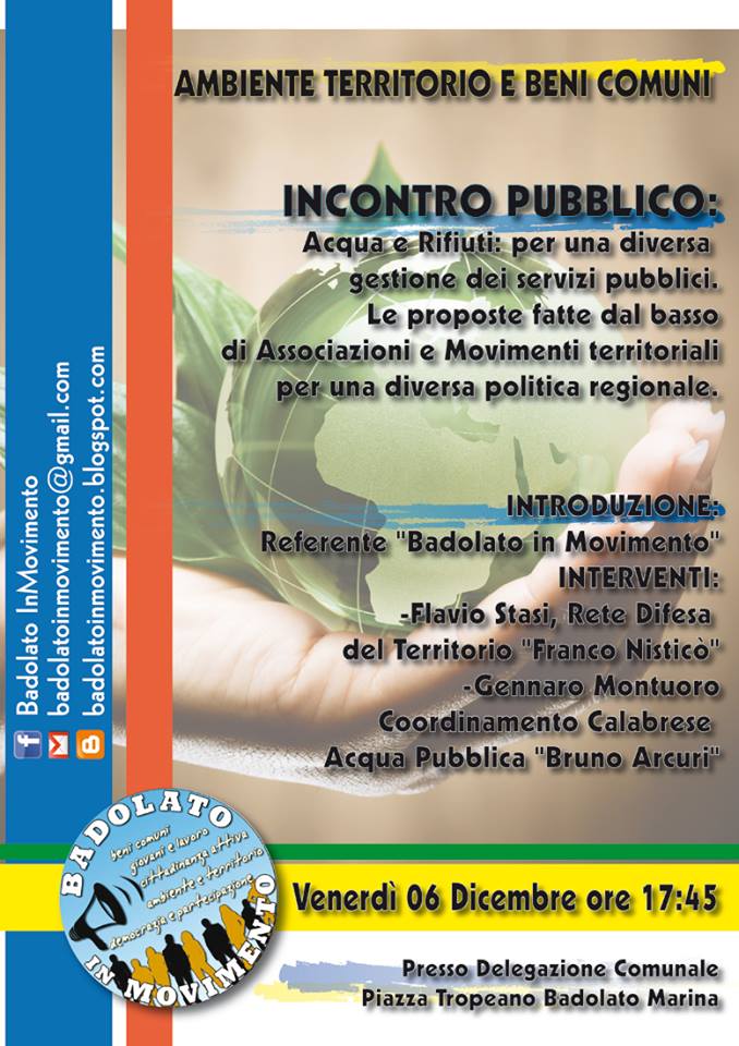 0 Acqua e Rifiuti: Venerdì 6 Dicembre, Badolato (CZ) Posted on 9 Dicembre 2013 by Redazione “Acqua e Rifiuti: per una diversa gestione dei servizi pubblici.” Le responsabilità della situazione attuale e i modi per uscire dall’emergenza rifiuti. Non ci sono più alibi!