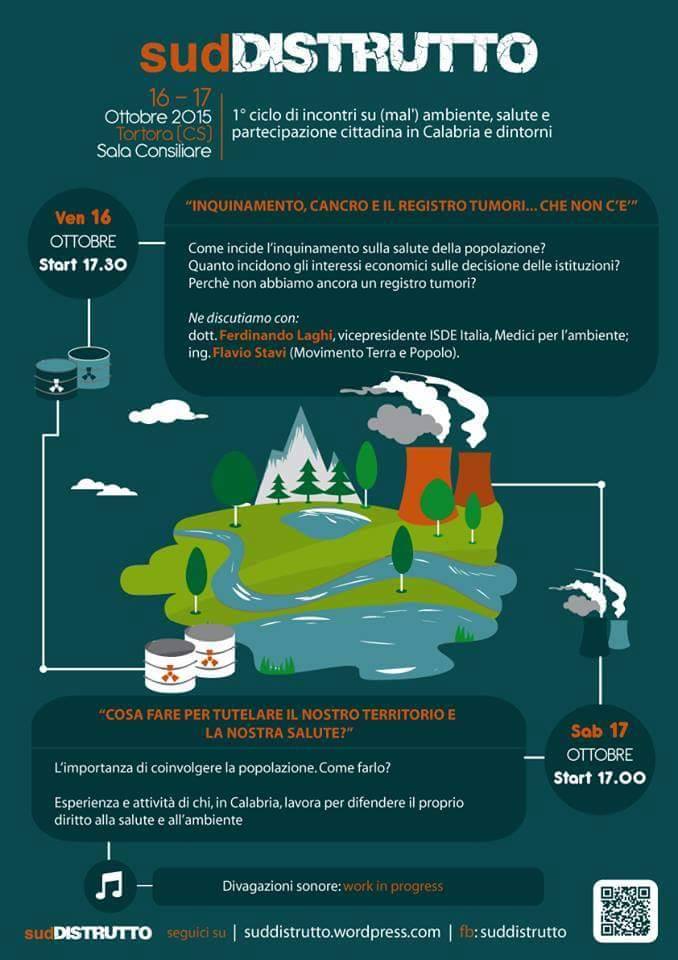 Venerdì 16 Ottobre, a Tortora (CS), si terrà un incontro sul tema “Inquinamento, cancro ed il registro tumori che non c’è”. I relatori dell’incontro saranno Ferdinando Laghi, vicepresidente nazionale ISDE Italia (International Society of Doctors for the Environment) e Flavio Stasi, portavoce del movimento Terra e Popolo, il quale da anni combatte una battaglia per l’istituzione del Registro Tumori in Calabria col fine di disporre, finalmente, strumenti di cura e prevenzione adeguati all’epidemia che sta colpendo la nostra regione.