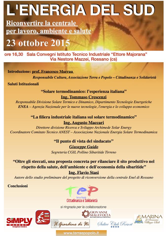 0 Sala Convegni ITI Rossano, convegno “L’energia del Sud” Posted on 23 Ottobre 2015 by Redazione Relatori autorevolissimi ci aiuteranno a formulare una proposta per il sito produttivo Enel che possa tutelare lavoro, salute ed economia della Sibaritide.