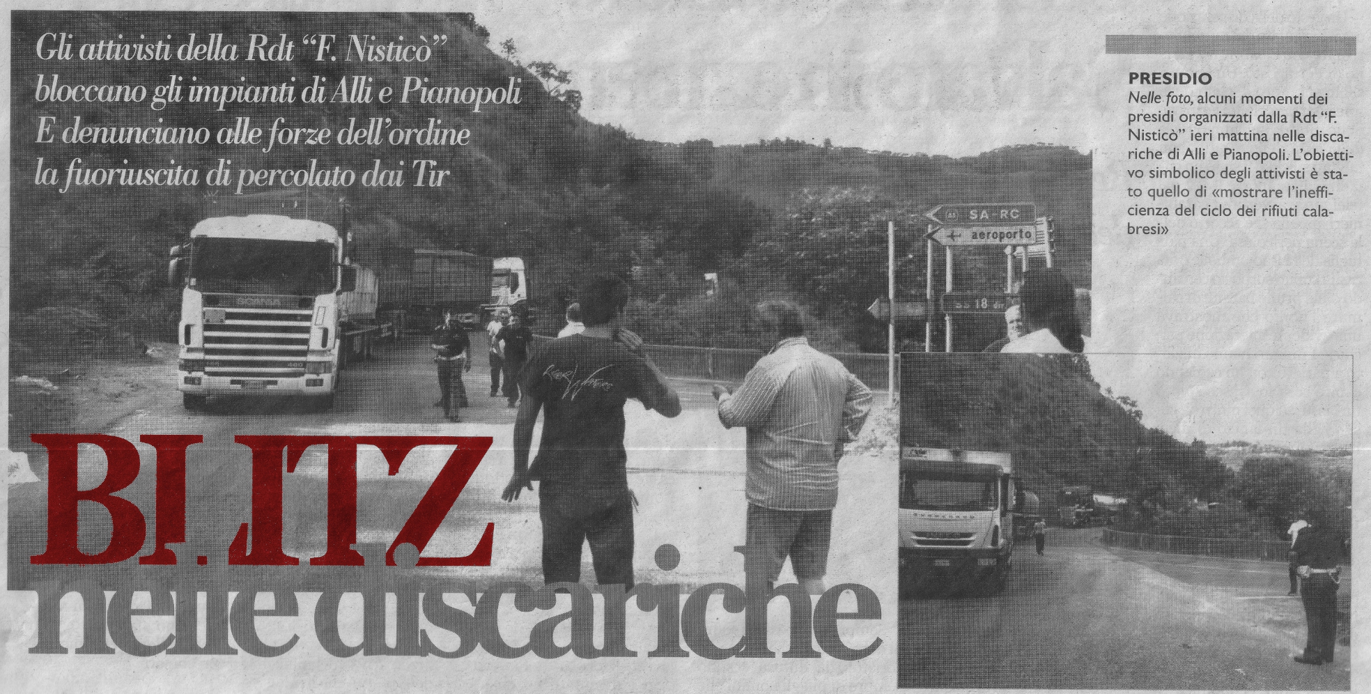 Alle 10:30 del 16 agosto, dopo circa dieci ore di presidio delle discariche di Alli e Pianopoli, i cittadini e gli attivisti della RDT F. Nistico’ hanno deciso di smobilitare avendo constatato il verificarsi puntuale di quanto paventato nel lancio delle iniziative. Una gestione pericolosa quanto errata dei rifiuti solidi urbani, lo sversamento in discarica del tal quale in spregio della normativa comunitaria, i danni prodotti dal trasporto dannoso e per certi versi illegale dei rifiuti, con perdita di percolato e la abnorme concentrazione di conferimenti sostanzialmente in un unico sito, attestano il fallimento della gestione commissariale in Calabria. Dopo aver segnalato tutto cio’ ai mass media ed agli organi competenti, si e’ deciso di continuare a richiedere la chiusura delle pericolose discariche attive sul territorio calabrese, una gestione virtuosa del ciclo dei rifiuti e la fine della gestione emergenziale.